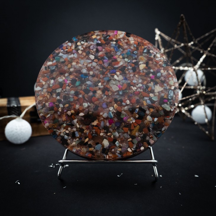 The live water charging plate has two functions. It acts as an orgonite that protects against radiation. It also acts as a base on which to place a glass of water. The water on this charging plate comes to life. The base energizes the water, giving it energy, making it livelier, making it softer and without toxin.