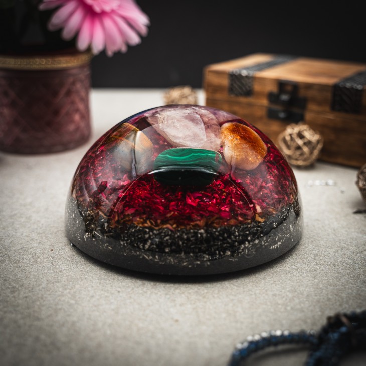 Vsak orgoniti je unikaten in čaroben. Ker delamo nekatere orgonite v večjem številu, so lahko manjša odstopanja v obliki in velikosti kristala.